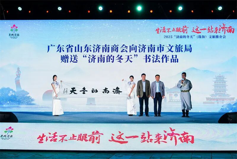 活动现场的“三城联动”环节温情满满。广东省山东济南商会会长王军船是地道的济南人,在珠海深耕打拼了20多年。他向济南市文旅局赠送了“济南的冬天”书法作品,并表示作为连接两市的桥梁,济南商会愿为两市文旅合作发展开辟更多渠道,搭建更多平台。