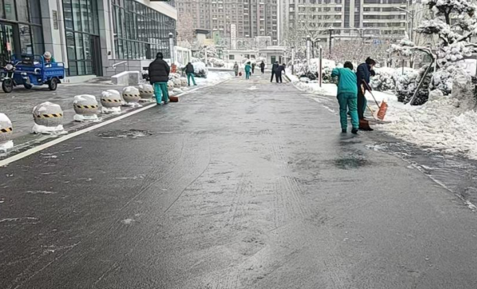 这场高效的清雪行动背后,是一支由医院职工,物业保洁人员,安保队员和停车管理员组成的“破冰”队伍在深夜和凌晨的奋战。