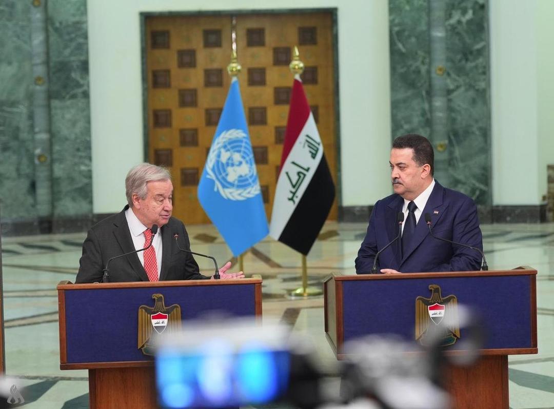 当地时间12月13日,伊拉克总理苏达尼在巴格达会见来访的联合国秘书长古特雷斯。