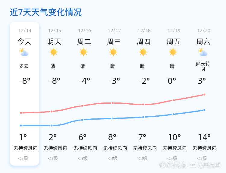 未来三天(12月16日至12月17日),济宁市天气持续晴朗,气温逐步回升,最高气温将升至8℃,最低气温回升至-3℃。市民应根据天气变化及时增减衣物,预防感冒。特别是天气晴朗,适合户外活动,但早晚温差较大,出行时仍需注意防寒保暖。