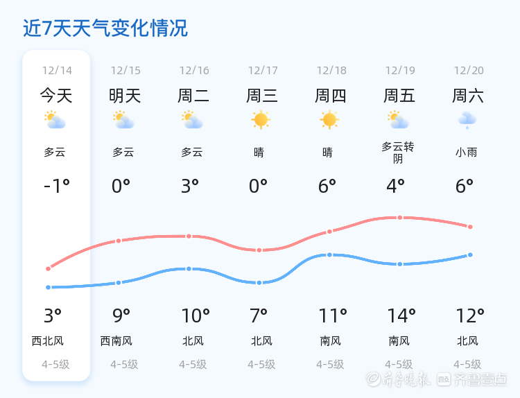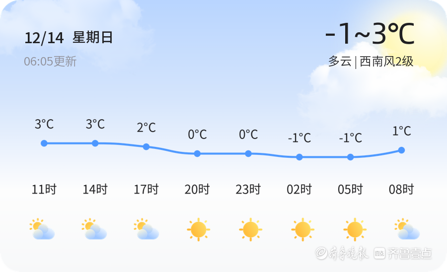 12月14日,星期日,农历十月廿五,威海市迎来一个以多云为主的天气。今日气温较为温和,最高气温3℃,最低气温-1℃,风力适中,西南风2级,空气湿度79%,PM2.5指数为35,空气质量良好。各区天气情况基本一致,均为多云,适宜市民户外活动。