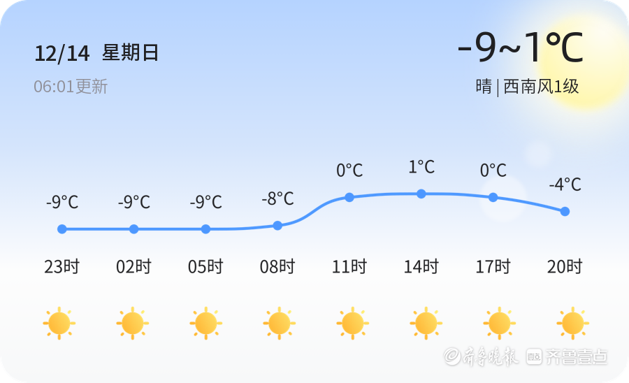 今日是12月14日,星期日,农历十月廿五,淄博市迎来了一天晴朗的好天气。全市范围内气温较为平稳,最高气温达到1℃,最低气温为-9℃,目前实时气温为-7.7℃。风力较小,西南风1级,空气湿度为89%,PM2.5指数为50,空气质量良好,适合户外活动。