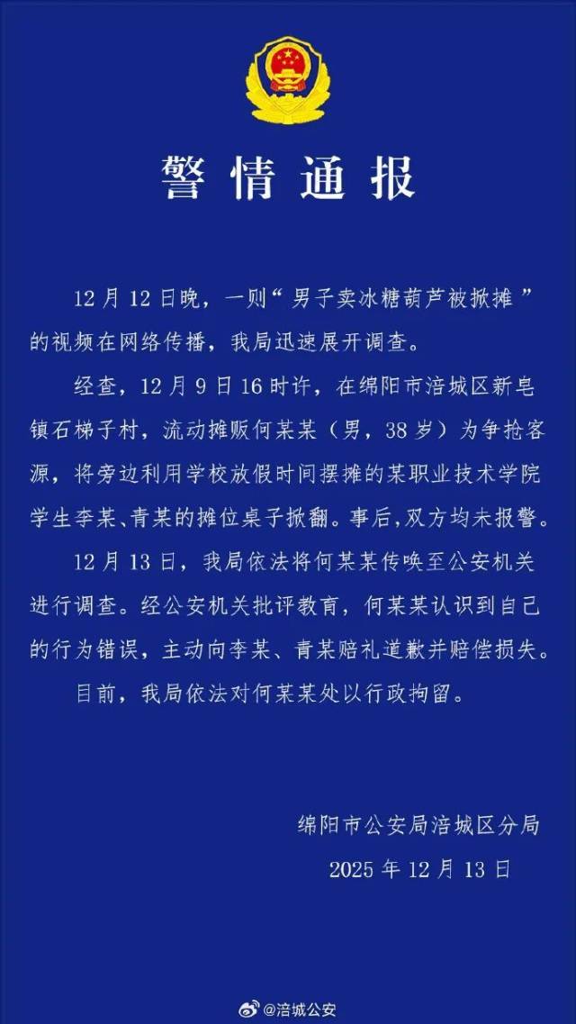 四川警方通报“男子卖冰糖葫芦被掀摊”