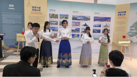 活动现场,除了汉服动态展示,还设有牡丹与汉服文创静态展区。来自曹县的汉服与菏泽的牡丹文创并列陈设,直观地诠释了“文化+产业”的出海模式。许多学生在试穿汉服后,聚集在展台前询问绣花工艺、面料来源,甚至讨论起能否通过曹县的海外电商渠道购买。