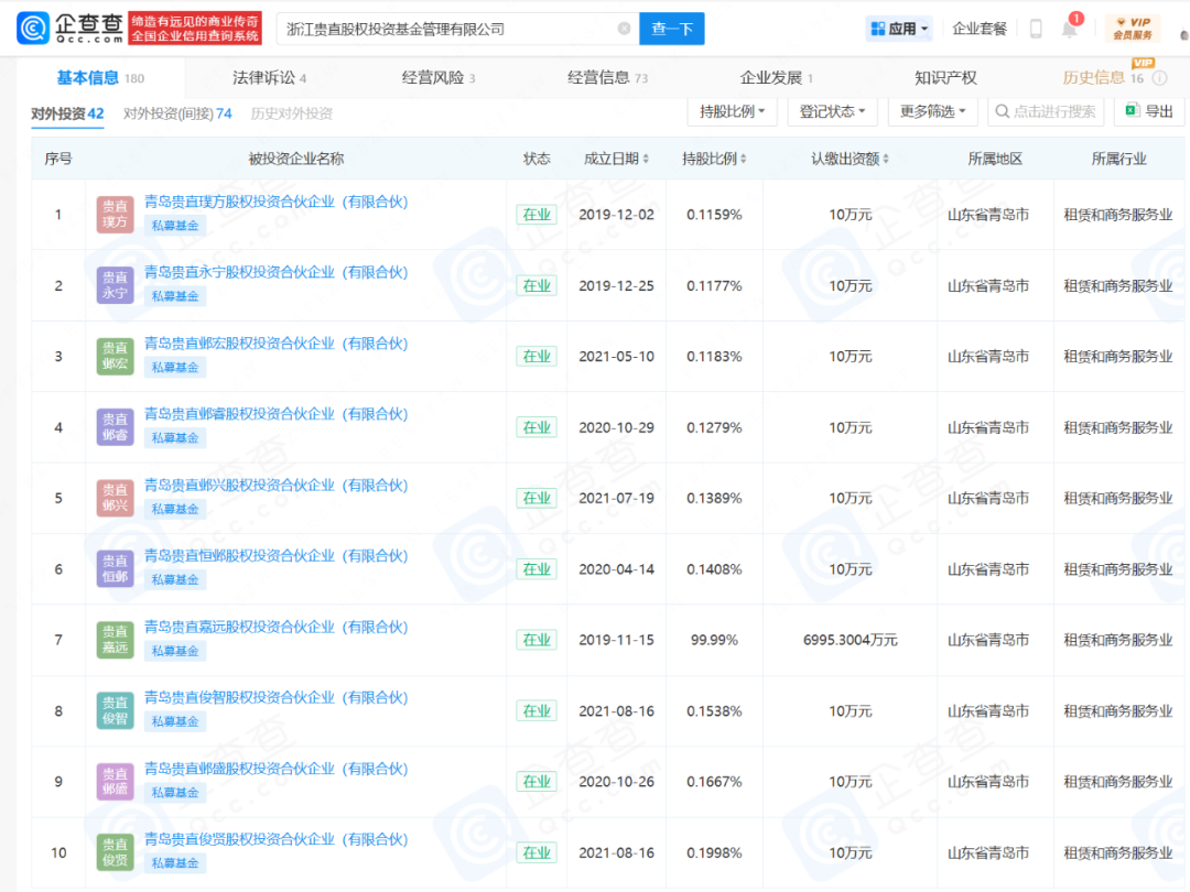 股权穿透信息显示,优策投资的大股东为杭州连芯投资管理合伙企业(有限合伙)(下称“连芯投资”),该合伙企业的实际控制人为李晓晴。值得关注的是,连芯投资还控制着另一家私募基金公司——浙江贵直股权投资基金管理有限公司(下称“浙江贵直”),其法人代表为顾晓东。企查查数据显示,浙江贵直作为合伙人在青岛设有17只私募基金,且这些基金目前仍处于正常运营状态,其投资方向大多集中于陕西、上海两地的企业。