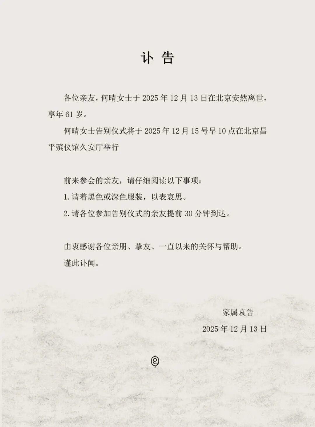 据北京日报客户端消息,12月13日,著名演员何晴家属发布讣告显示,何晴在北京安然离世,享年61岁。告别仪式将于2025年12月15日早10点在北京昌平殡仪馆久安厅举行。