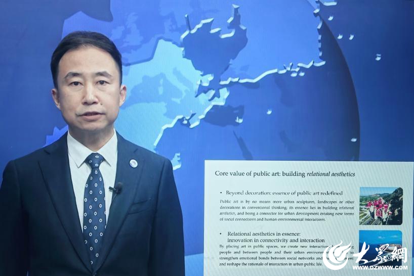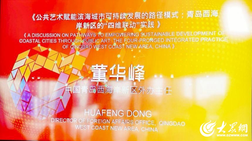 青岛西海岸新区工委外办主任董华峰,作为多次受邀担任国际公共艺术大会的主持人和主旨演讲嘉宾,其本次提交大会的专题报告——《浅谈公共艺术赋能滨海城市可持续发展的路径模式——青岛西海岸新区的“四维联动”实践》,获得大会组委会终审通过。同时中国通过的还有来自北京、上海两位专家的报告。在联合国总部大会的主旨演讲环节中,董华峰通过线上方式,从公共艺术角度用英文向全球与会者系统分享了青岛西海岸新区可持续发展的路径模式和实践,这是青岛西海岸新区首次在联合国总部的全球平台上进行的城市形象推介。