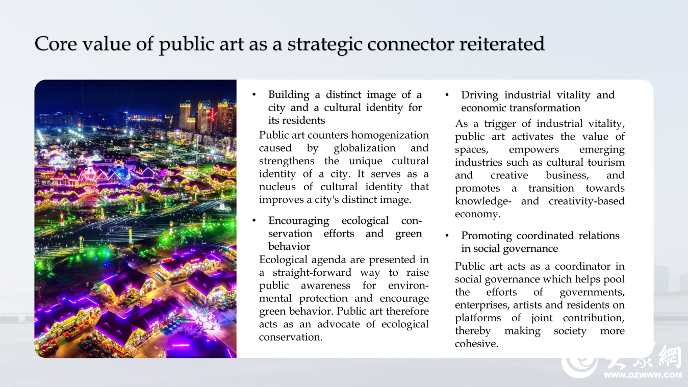 同时,国际公共艺术主题论坛以公共艺术的视角,通过文化外交,探索促进联合国可持续发展目标实现的方式与路径,宣传世界特色城市的魅力,推广重点城市的成功经验与示范性,推动国际城市间交流、对话与合作。该论坛在全球范围内遴选10座有代表性的不同特质的世界特色城市,由组委会研究推荐的公共艺术专家作主旨发言。内容从公共艺术的理论和实践展开,不涉及政治、意识形态等敏感问题,重点宣传世界城市的发展经验与价值。最终,全球遴选的10座世界特色城市的主旨演讲专家,经大会组委会和联合国相关机构终审确定。