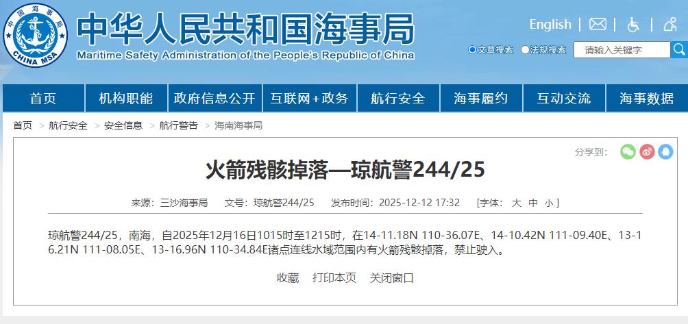 三沙海事局发布航行警告12月16日10时15分至12时15分南海部分水域范围内有火箭残骸掉落禁止驶入央视新闻