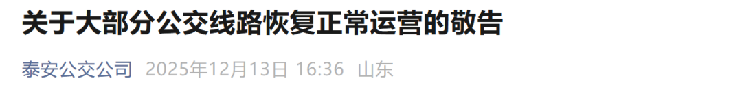 12月13日,泰安公交公司微信公众号发布关于大部分公交线路恢复正常运营的敬告,具体如下:
