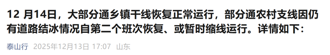 12月14日,据泰山行消息,通往乡镇干线的公交线路大部分恢复正常运行,部分通农村支线因仍有道路结冰情况自第二个班次恢复、或暂时缩线运行。具体如下: