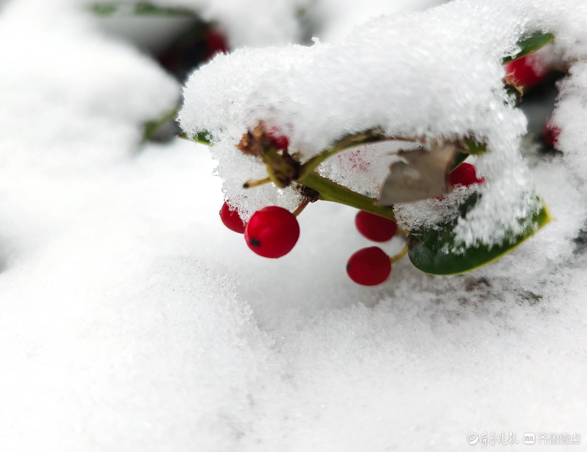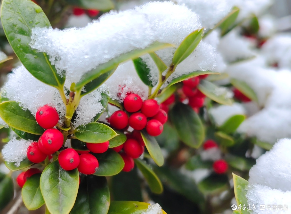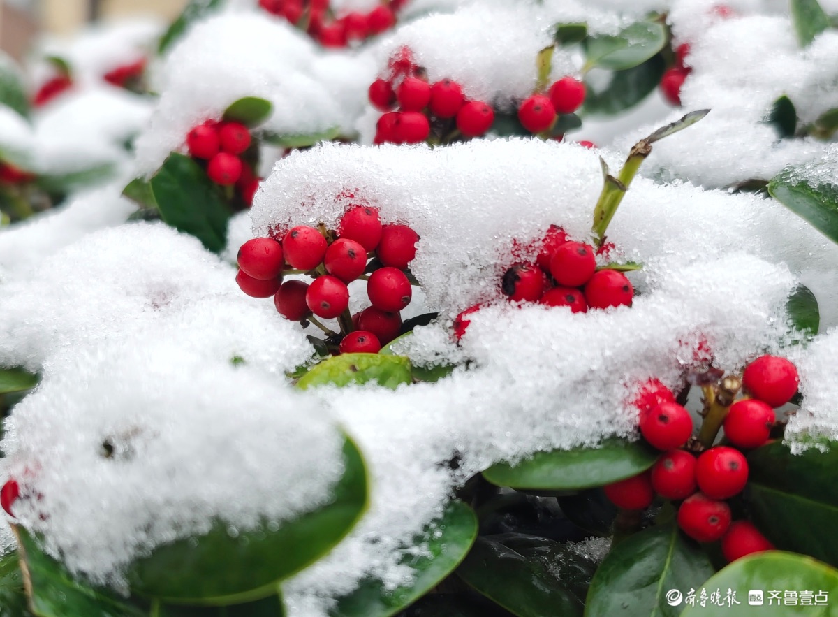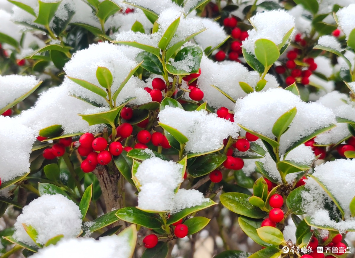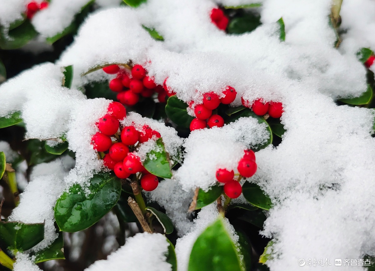 12月13日一场小雪覆盖了万物处处银装素裹小区绿化带里的冬青红果被白雪覆盖隐约露出鲜艳的红色别有意趣高军摄