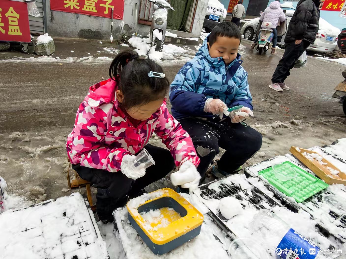 12月13日,在济南十六里河西河村,孩子们在街头用模具玩雪。