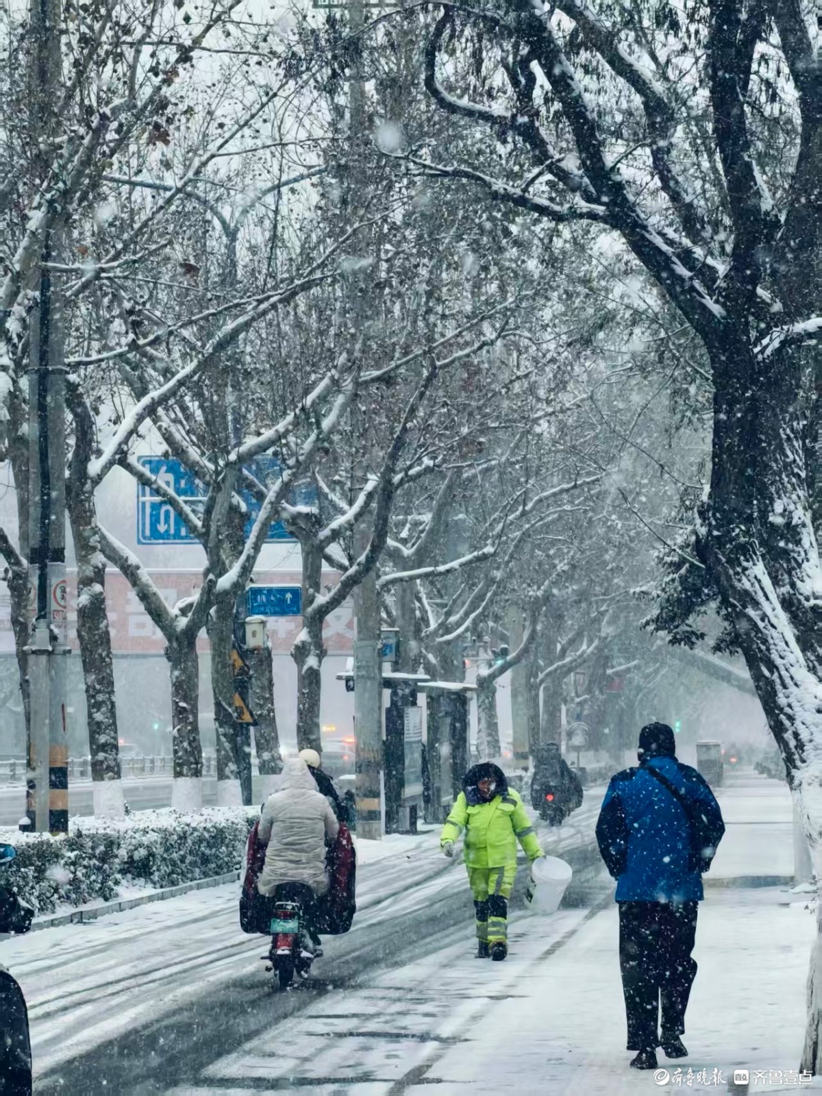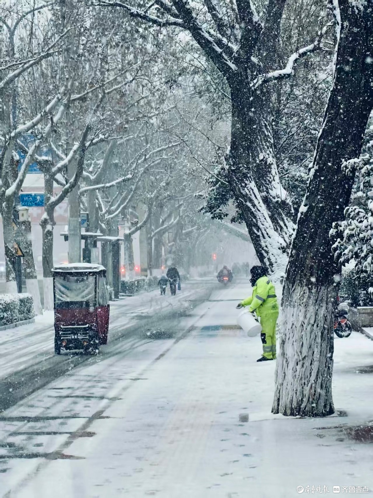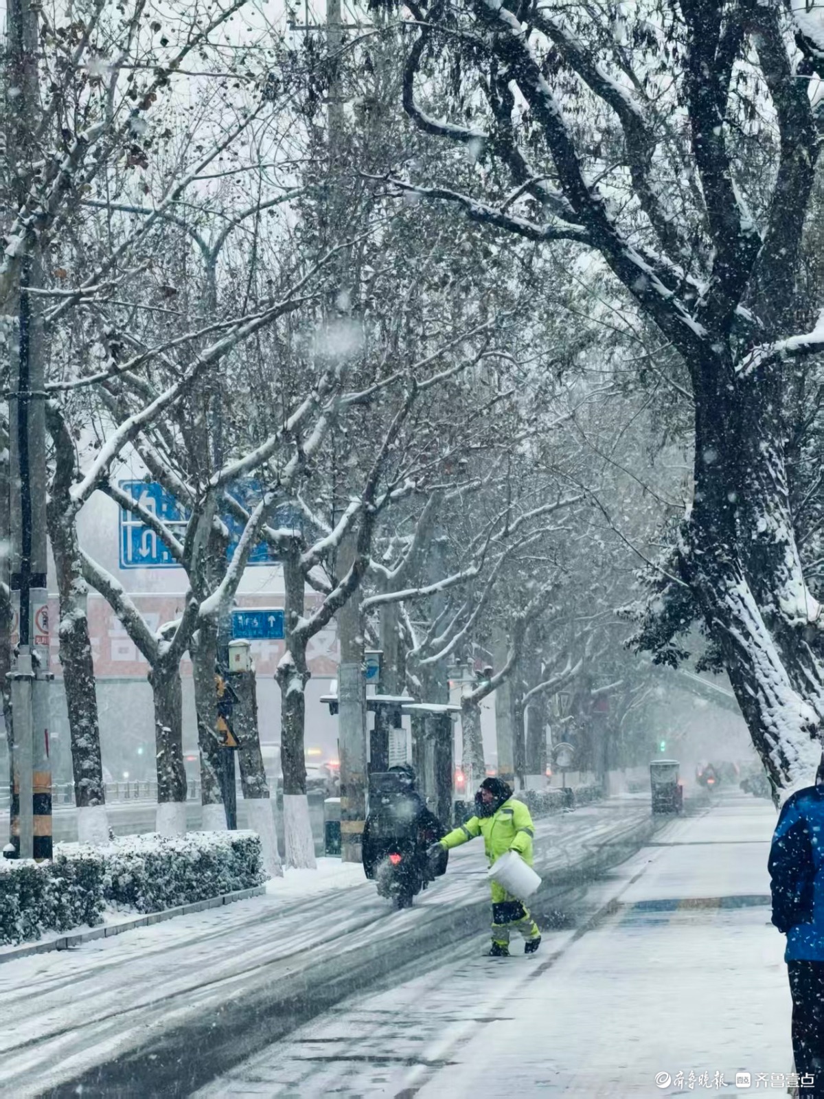 泉城迎来大雪,环卫工人顶风冒雪撒融雪剂