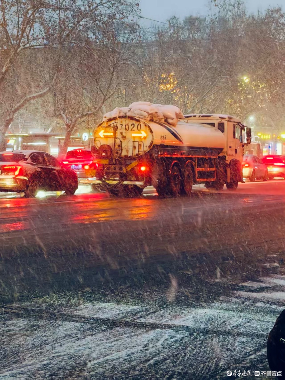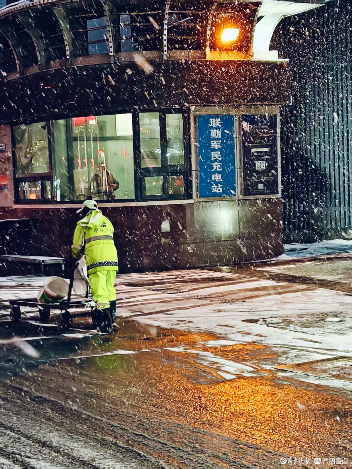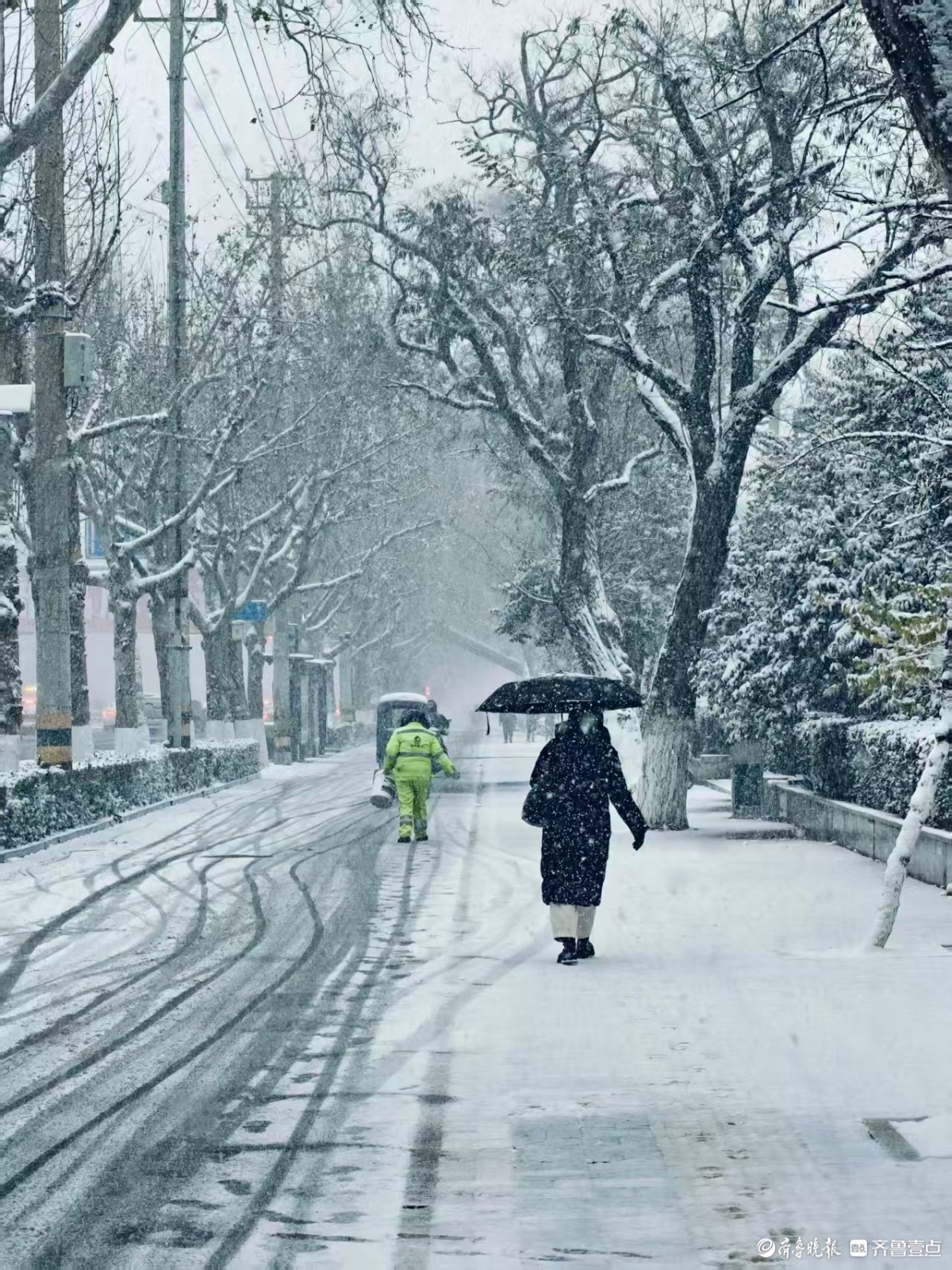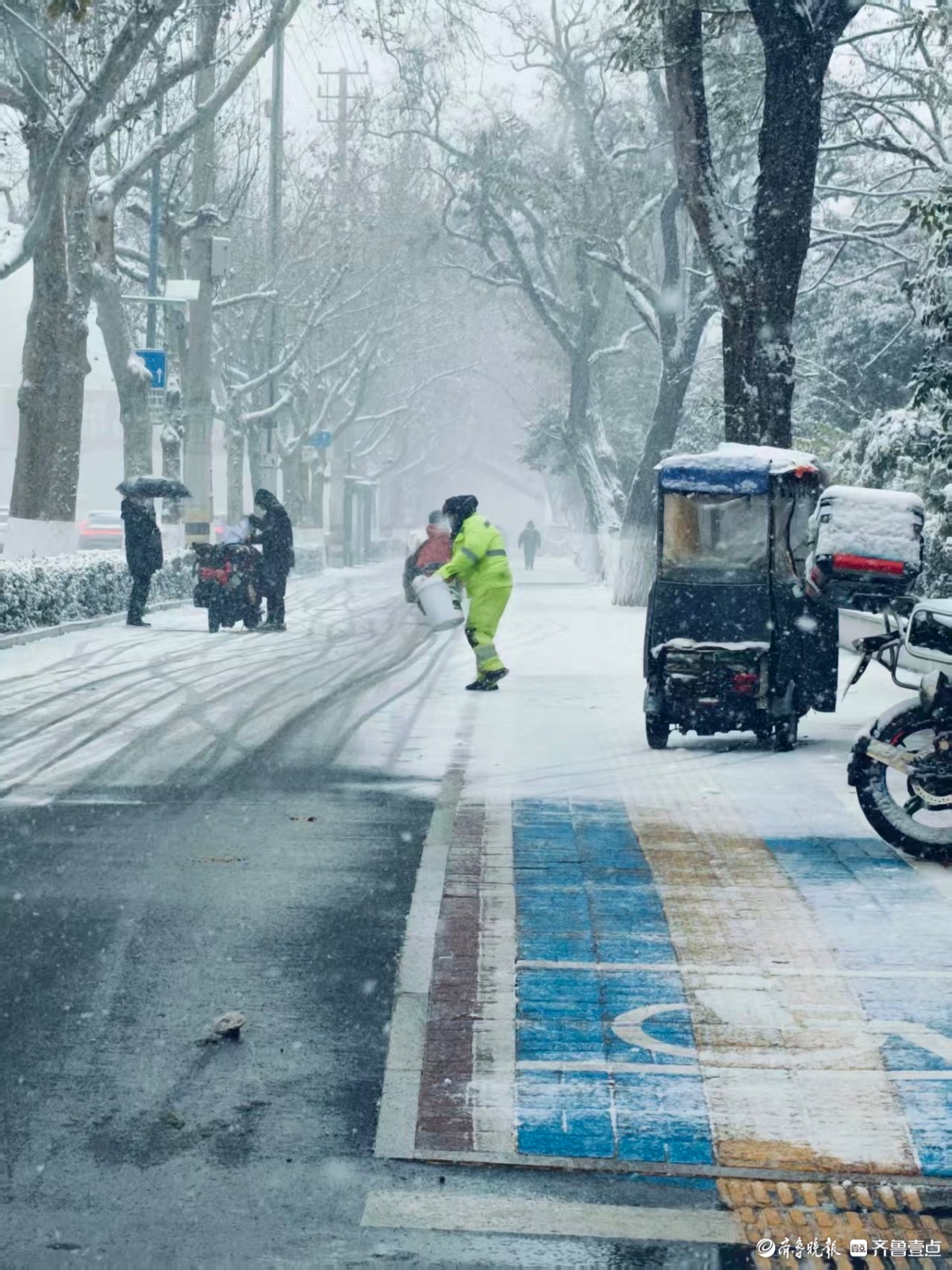 泉城迎来大雪,环卫工人顶风冒雪撒融雪剂