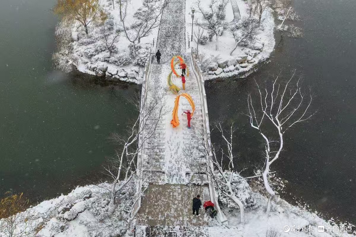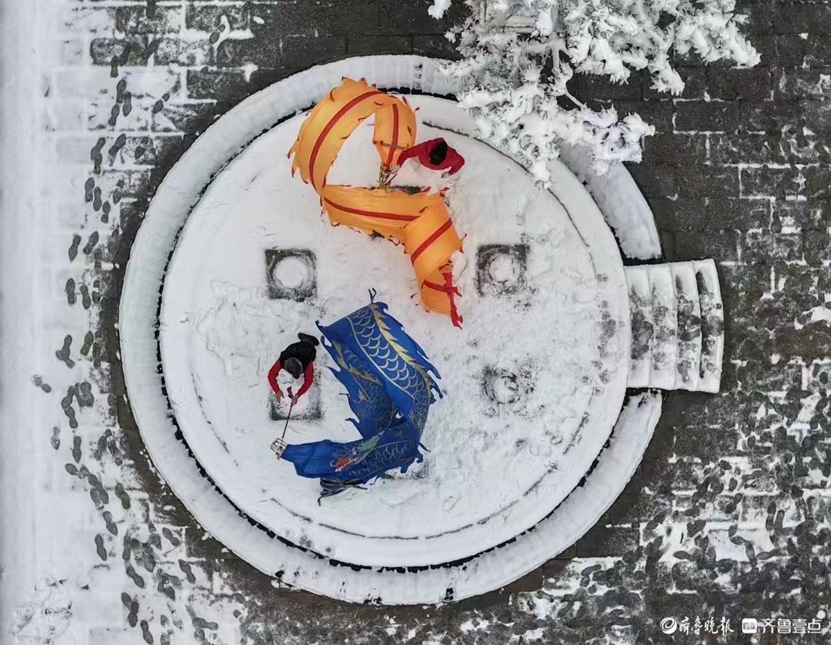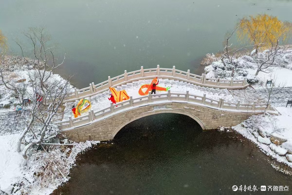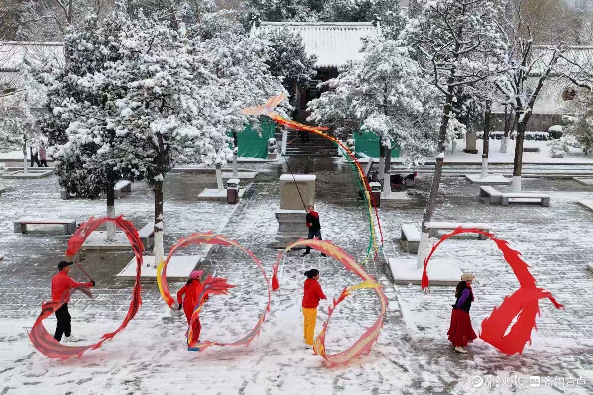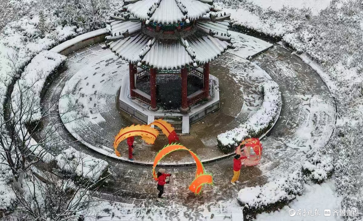 12月12日济南迎来了今冬第一场大雪华山景区一片银装素裹黛色山影在薄雾中朦胧枝头的雪絮簌簌勾勒出清冷的冬日画卷而这片素白里却燃着跃动的红健身龙爱好者们踏雪而来红金相间的龙绸在他们手中翻飞或绕成圆虹或甩作长练雪沫被龙绸带起的风卷动与飘带缠作一团舞者的身影在亭台石桥间辗转呵出的白气混着龙绸的红让清冷的华山雪景多了满溢的生机与人间暖意王平摄