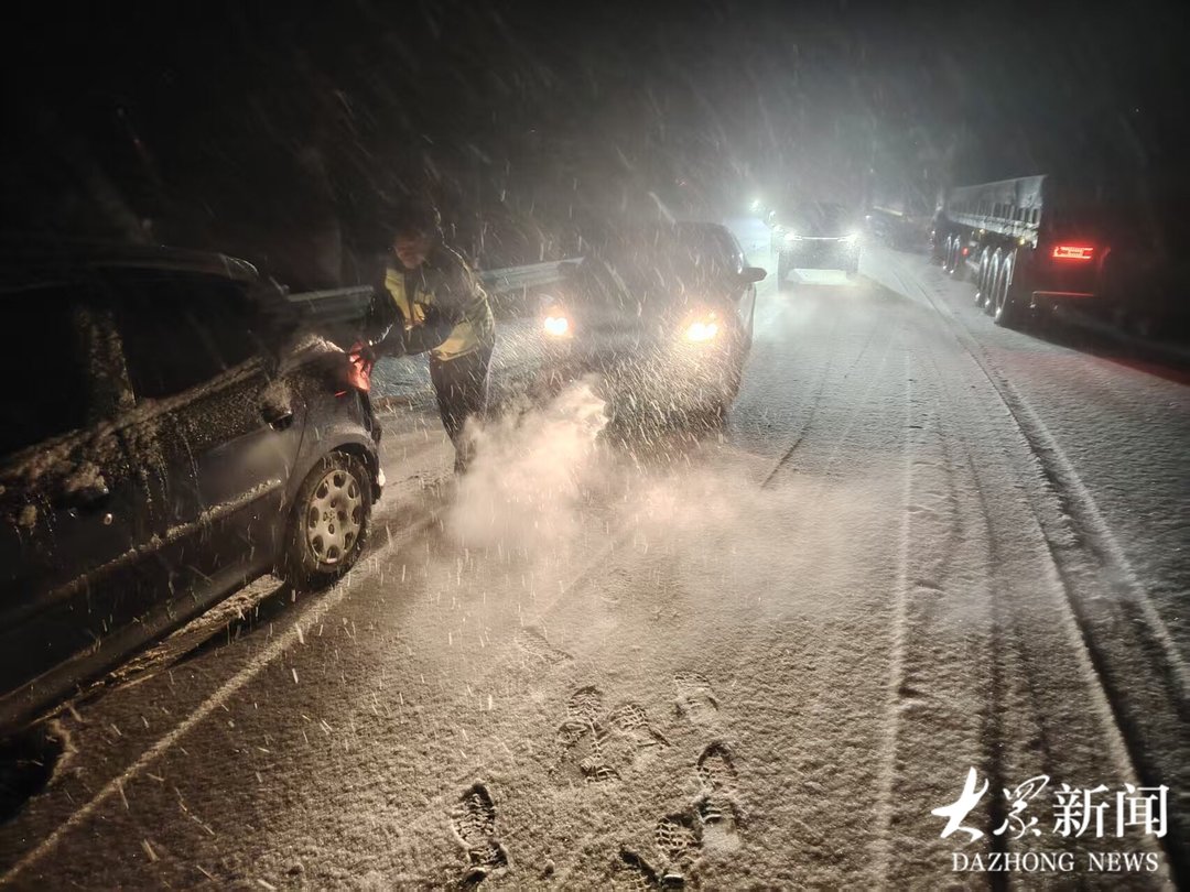 快速路中队动态调整警力部署,通过大屏、电台发布提示信息,协调增援警车。原山快速路南段曾因路面结冰突发连环事故,警力快速处置,此路段于21时10分恢复通行。