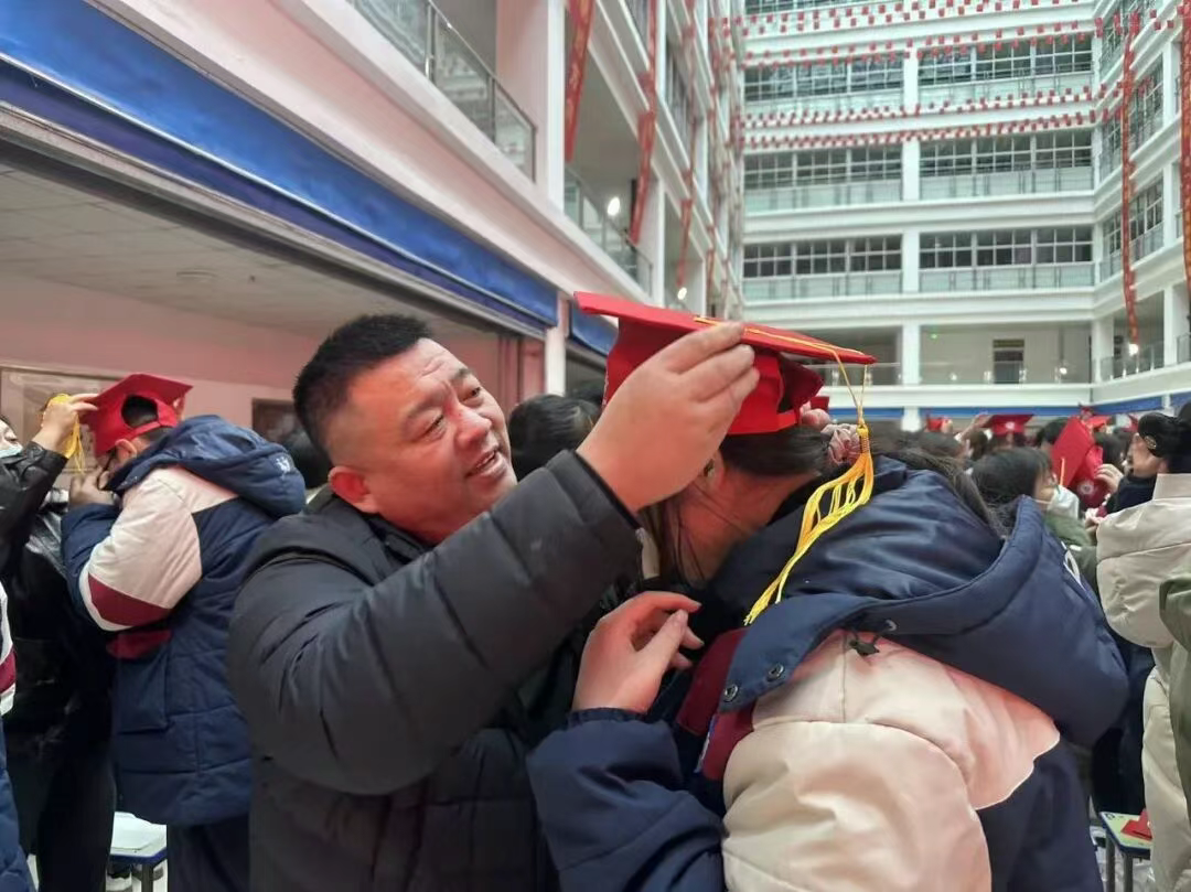 第一篇章“十八而志・感恩同行”活动中,学生代表们伴着《时间都去哪了》的旋律跳起手势舞,温柔的歌声与真挚的动作,道出了对父母养育之恩的感激。随后家长代表的发言朴实而深情,回顾了陪伴孩子成长的酸甜苦辣,也送上了对孩子们成人后的美好祝福。核心仪式环节,学子们接过象征责任与荣耀的《宪法》,戴上庄重的成人帽,与身旁的父母互换家书、深情拥抱,泪水与笑容交织,传递着亲情的温度与成长的责任。