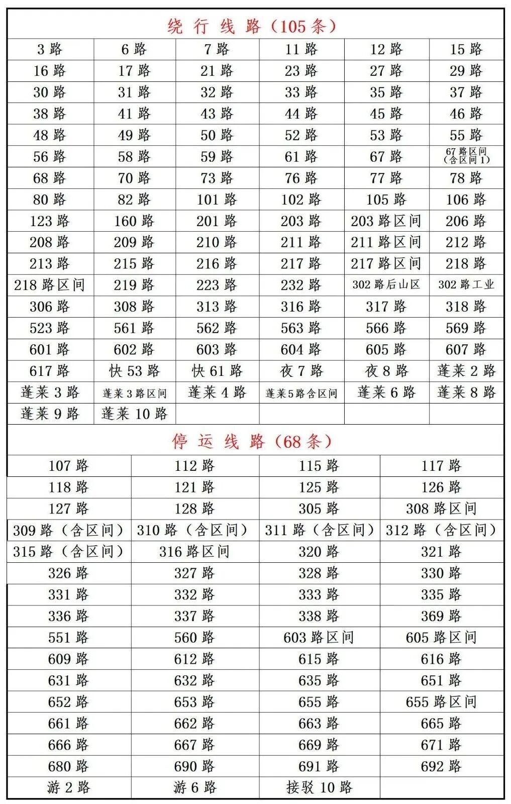 本方案共涉及173条线路,其中105条公交线路遇冰雪恶劣天气视情绕行,68条公交线路遇冰雪恶劣天气视情停运(停运线路多为恶劣天气下路况较差的线路)。