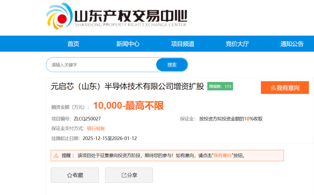 12月15日,元启芯(山东)半导体技术有限公司(下称“元启芯半导体”)增资扩股项目在山东产权交易中心挂牌,融资额不低于1亿元。