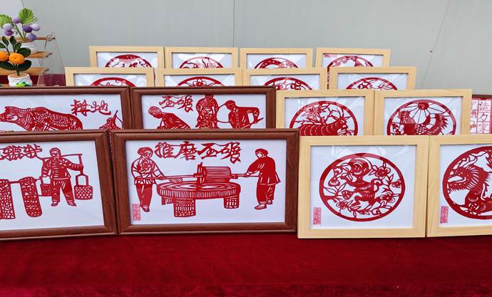 活动现场,非遗传承人正手持红纸,剪刀游走间,一幅“诚信为本”主题剪纸跃然纸上。她边剪边讲解:“这朵莲花象征纯洁,这把尺子代表公平,剪纸的每一刀都要精准,就像做人要守住底线。”同时,非遗传承人展示之前已经完成好的剪纸作品《福》和其他剪纸作品及钩织作品。通过非遗传承人的现场讲解,让村民直观感受到传统技艺与道德理念的深度融合,进一步加强美育浸润。