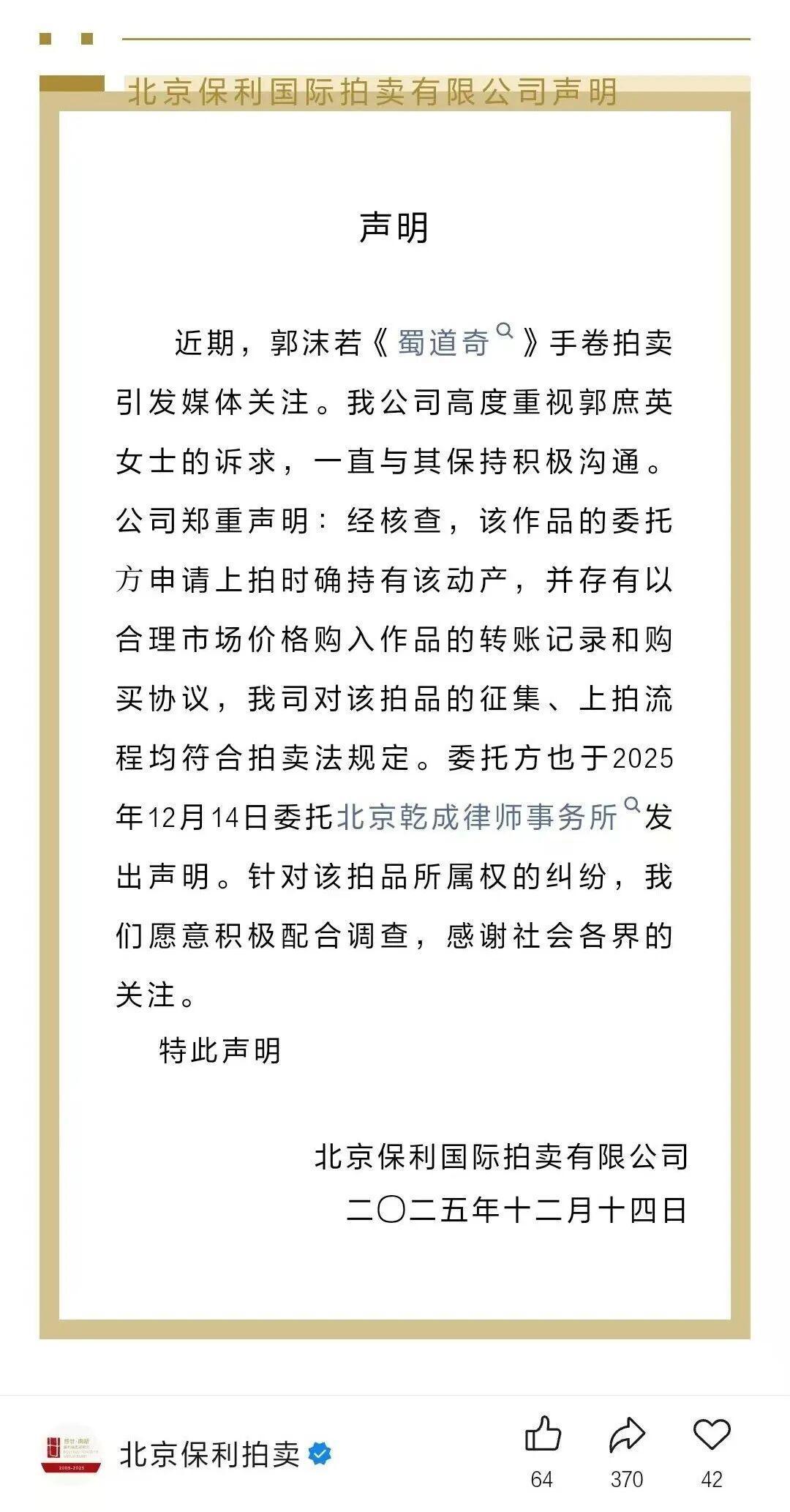 12月14日,北京保利国际拍卖有限公司发布声明称,郭沫若《蜀道奇》手卷的委托方申请上拍时确持有该动产,并存有以合理市场价格购入作品的转账记录和购买协议,公司对该拍品的征集、上拍流程均符合拍卖法规定。委托方也于2025年12月14日委托北京乾成律师事务所发出声明。针对该拍品所属权的纠纷,北京保利拍卖愿意配合调查。