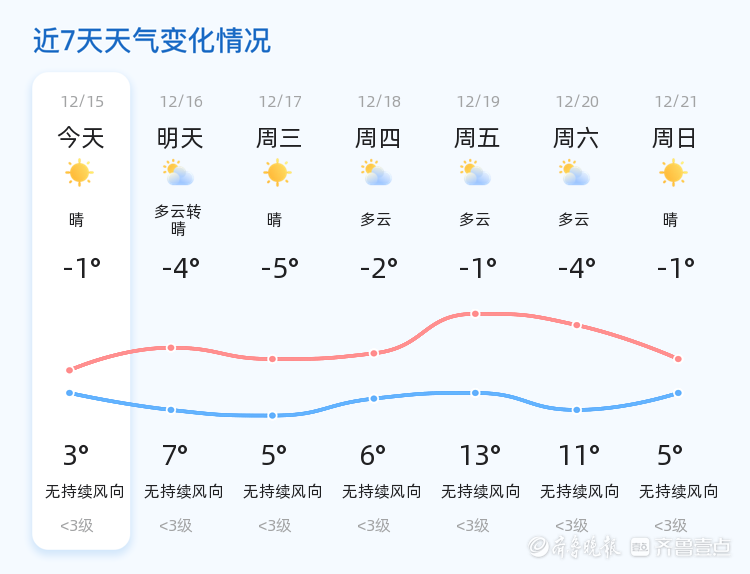 今天是12月15日,星期一,农历十月廿六。泰安市今天天气晴朗,温度在-1℃到3℃之间。目前,泰安市区温度为-4.7℃,西北风1级,空气湿度为92%,PM2.5指数为117。各区天气情况基本一致,均为晴天,温度温和,适合外出活动。明天天气将有所变化,预计为多云转晴。与今天相比,明天的气温有所回升,低温将上升至-4℃,高温将上升至7℃。市民朋友们可以感受到一天中温度的变化,早出晚归时仍需注意保暖。未来三天,泰安市天气将以晴到多云为主,温度波动较大。周三气温最低降至-5℃,周四和周五气温有所回升,最高温度将达到6℃至13℃。市民朋友们需根据天气变化及时增减衣物,尤其是周三的低温天气,建议加强保暖措施,防止感冒。温馨提示