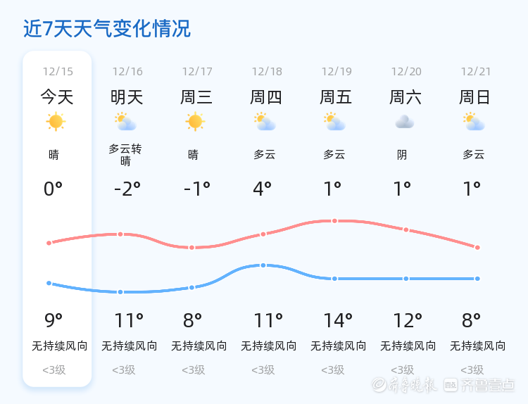 明天12月16日,星期二,济宁市天气多云转晴。相比今天,明天的气温有所回升,最低气温为-2℃,最高气温为11℃,昼夜温差较大,市民需注意保暖。