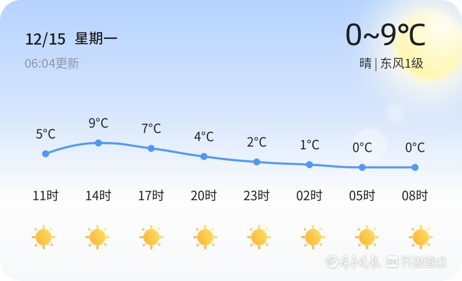 今天是公历12月15日,农历十月廿六,星期一。济宁市今天天气晴朗,气温较低,全市大部分地区气温在0℃到9℃之间。早晨的气温较低,达到了0℃,白天最高气温为9℃。风力较小,为东风1级,空气湿度为68%,PM2.5指数为79,空气质量良好。