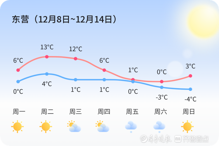全市周平均最高温8℃,平均最低温-1℃,平均气温3℃,周最高气温14℃,出现在周五,周最低温-4℃,出现在周日。