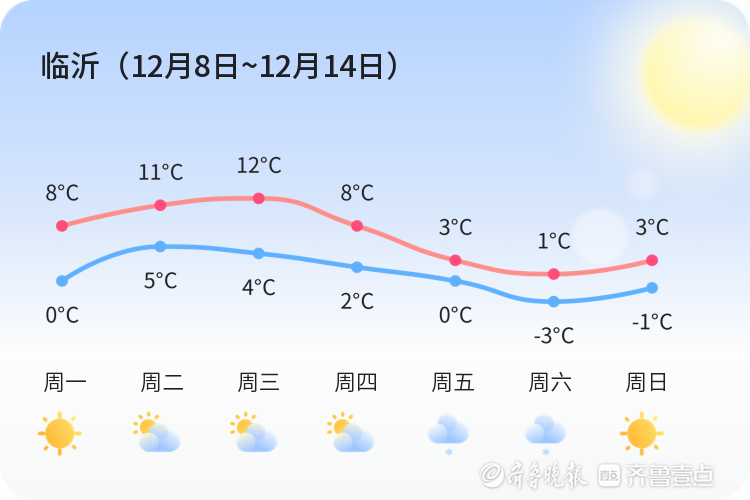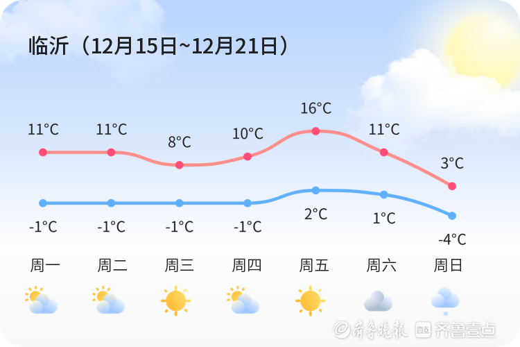 全市周平均最高温10℃,平均最低温0℃,平均气温4℃,周最高气温16℃,出现在周五,周最低温-4℃,出现在周日。