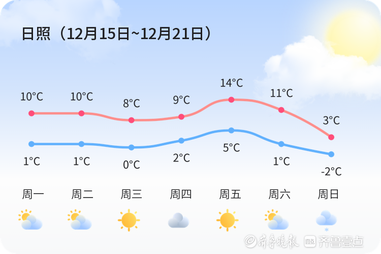 全市周平均最高温9℃,平均最低温1℃,平均气温5℃,周最高气温14℃,出现在周五,周最低温-2℃,出现在周日。