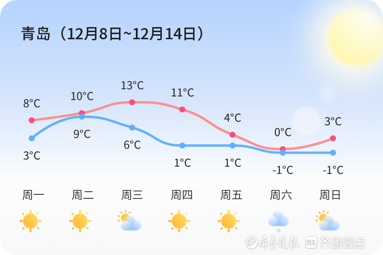 全市周平均最高温7℃,平均最低温2℃,平均气温4℃,周最高气温13℃,出现在周三,周最低温-1℃,出现在周六、周日。