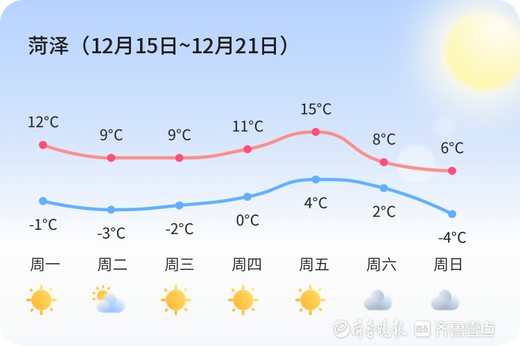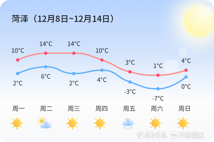 全市周平均最高温8℃,平均最低温0℃,平均气温4℃,周最高气温14℃,出现在周二、周三,周最低温-7℃,出现在周六。
