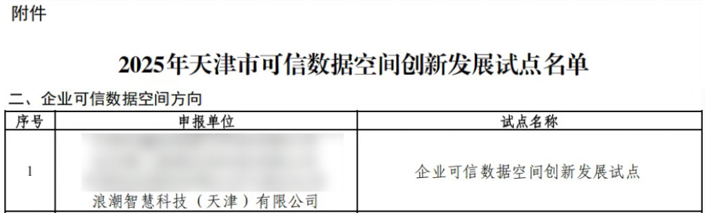 近日,天津市数据局公布“2025年天津市可信数据空间创新发展试点名单”。浪潮智慧科技(天津)有限公司作为联合申报单位之一,成功入选“企业可信数据空间创新发展试点”。这不仅体现了公司在数据可信流通与要素市场化配置方面的技术实力与实践能力获得权威认可,也为其进一步参与天津数据要素市场建设奠定了坚实基础。