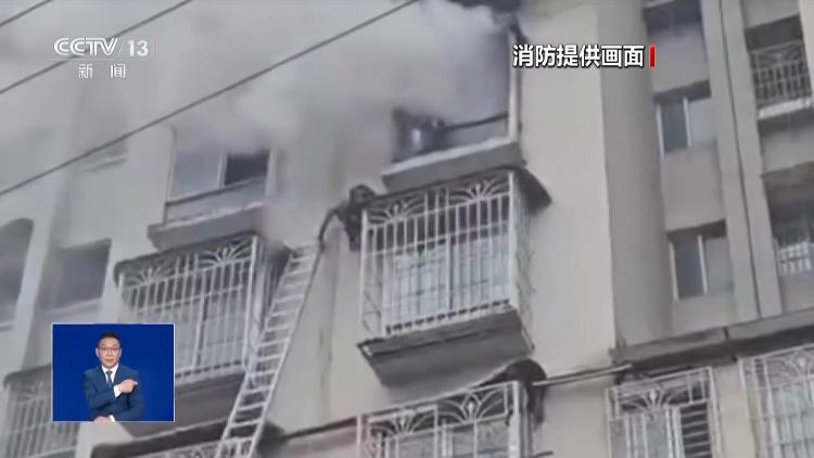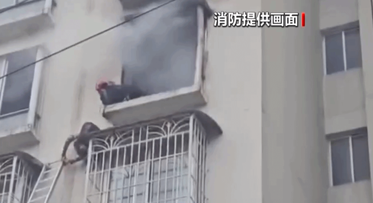 滚滚浓烟裹挟着火焰不断从窗口向外窜,被困男子此时蜷缩在楼下的防盗窗护栏上,已被浓烟包围。危急时刻,几名消防人员进入火场营救。