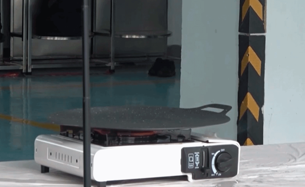 “小灶大锅”是使用卡式炉时最容易引发爆燃的原因之一。在试验中,消防人员在市面上购买了一个热销的卡式炉,将一个能覆盖到卡式炉气罐位置的较大烤盘放在炉子上加热,模拟烹饪场景。