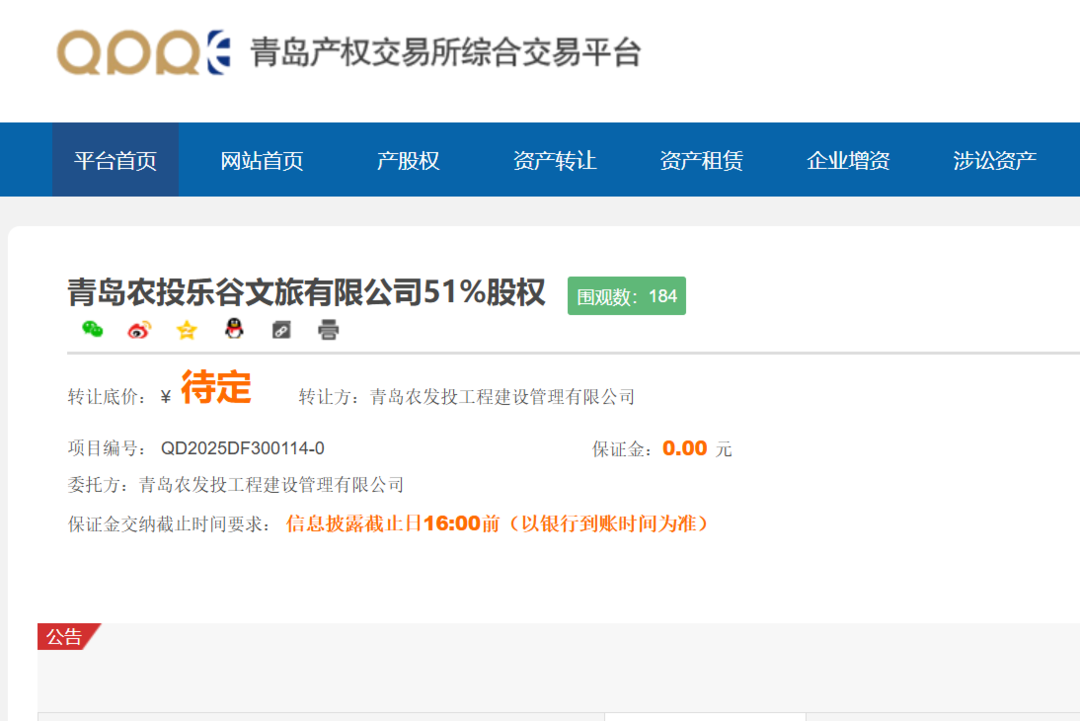 近日,青岛产权交易所预披露了青岛农投乐谷文旅有限公司(下称“青岛农投乐谷”)51%股权转让项目信息,转让方为青岛农发投工程建设管理有限公司(下称“青岛农发投工建”)。