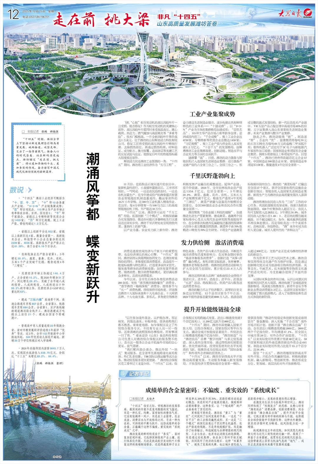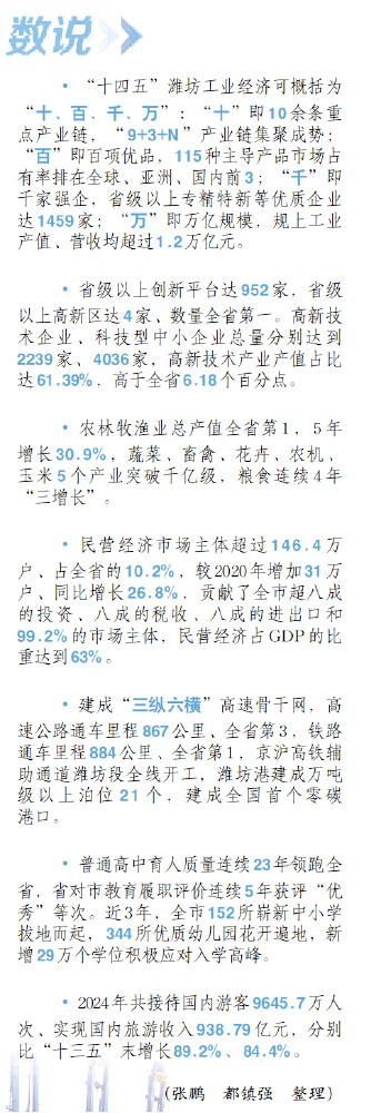 ■“十四五”时期,潍坊全市上下坚持以新发展理念引领高质量发展,砥砺奋进、攻坚克难,交出了一份厚重提气、振奋人心的时代答卷。站在新的历史起点,潍坊锚定“走在前、挑大梁”,将以更加昂扬的斗志、更加务实的作风,奋力谱写中国式现代化潍坊实践的崭新篇章。