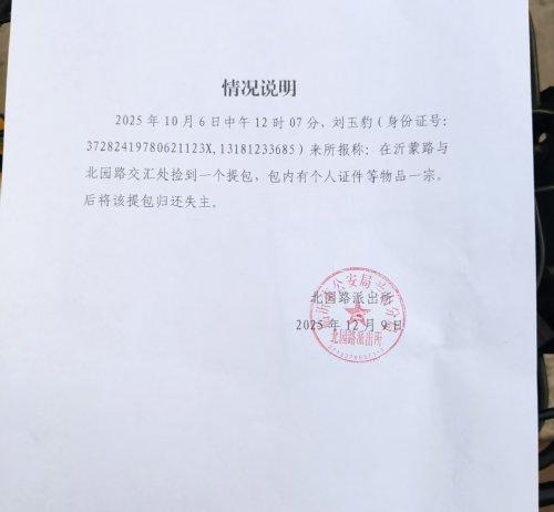 经了解,刘师傅于2025年10月6日在上门服务用户途中,行至沂蒙路与北园路交汇处捡到一个旧布包,打开发现包内有现金约两千余元、银行卡存折若干、身份证、购物卡、香烟及白酒等贵重物品,拾遗后刘师傅没有占为己有,第一时间想到的是这么重要的东西遗落失主肯定很着急,于是立即赶往辖区派出所将物品上交登记。