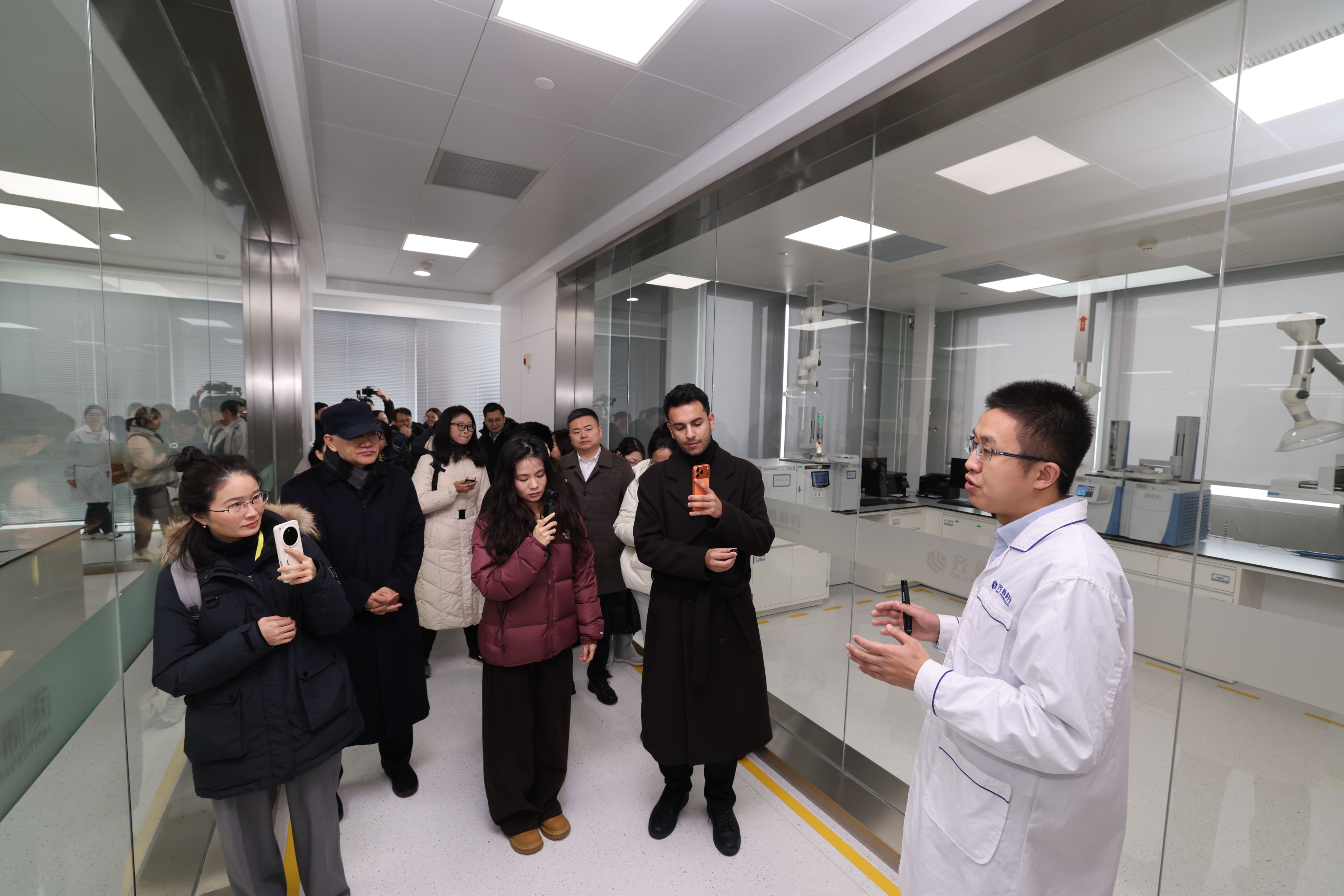 在质控中心,调研团得知齐鲁制药如何利用先进设备,对药品的原料、辅料、有效成分及杂质进行检测,通过严把质量关,保证每一粒、每一瓶出自齐鲁制药的产品都拥有“国际品质”,同时保障质检人员的健康安全。