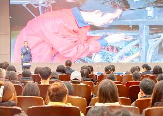 ▲张云泽在青岛酒店管理职业技术学院进行宣讲。(本版图片均由真情巴士集团提供)