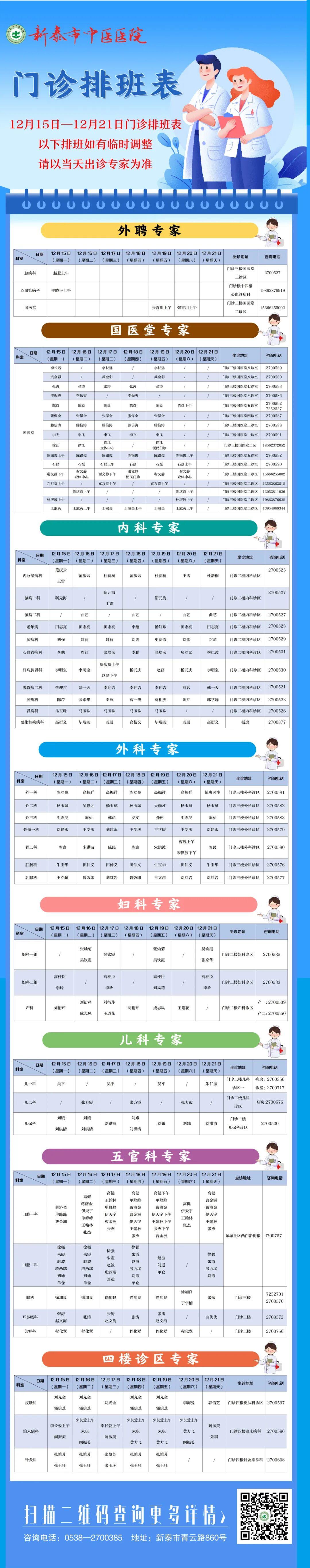 新泰市中医医院12月15日—12月21日门诊排班表来了,快来预约您心仪的专家吧~