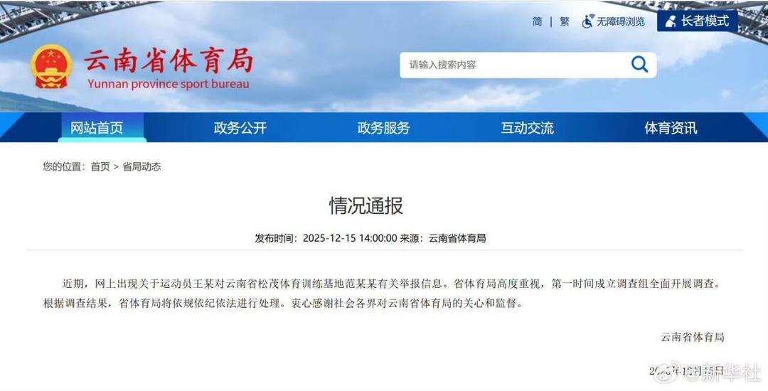 云南省体育局15日在官网发布关于“运动员王某视频举报事件”的情况通报。通报称:“近期,网上出现关于运动员王某对云南省松茂体育训练基地范某某有关举报信息。省体育局高度重视,第一时间成立调查组全面开展调查。根据调查结果,省体育局将依规依纪依法进行处理。衷心感谢社会各界对云南省体育局的关心和监督。”