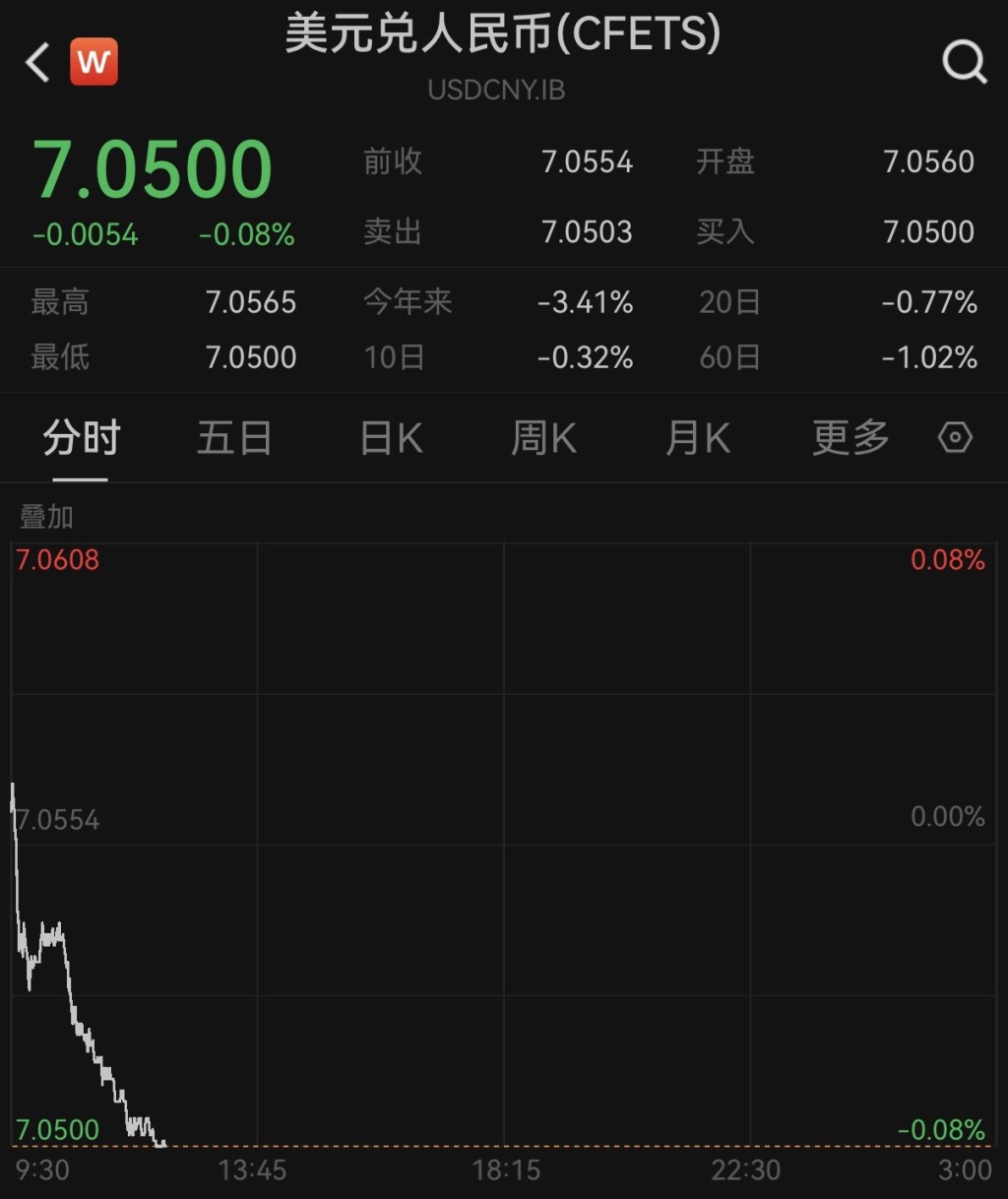12月15日,截至发稿,人民币对美元即期汇率盘中最高升至7.0500,为2024年10月9日以来首次触及7.05关口。