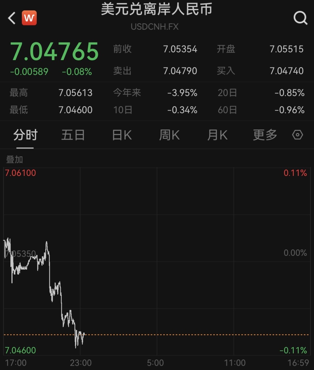离岸市场上,更多反映国际投资者预期的离岸人民币对美元汇率12月15日盘中最高升至7.046,创下2024年10月初以来的新高。