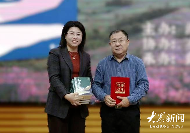 逄春阶向潍坊市图书馆捐赠了《芝镇说》系列图书,图书馆馆长考鲁明为其颁发收藏证书并致辞。
