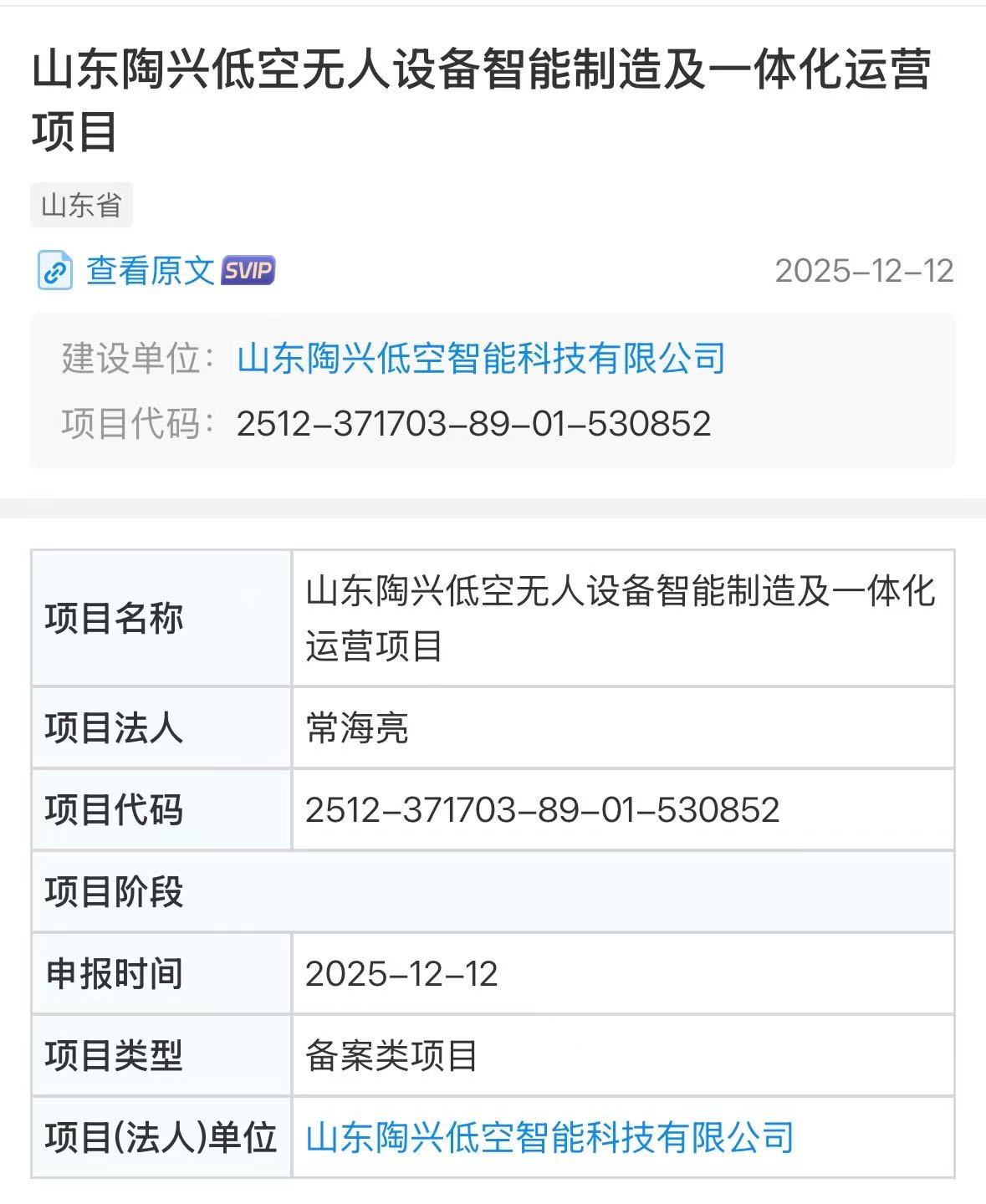 低空经济利好政策驱动下,低空装备制造赛道的入局者开始增多。12月12日,“山东陶兴低空无人设备智能制造及一体化运营项目”在山东省投资项目审批监管平台完成备案,标志着这一总投资额未公开的低空产业项目正式进入实施阶段。