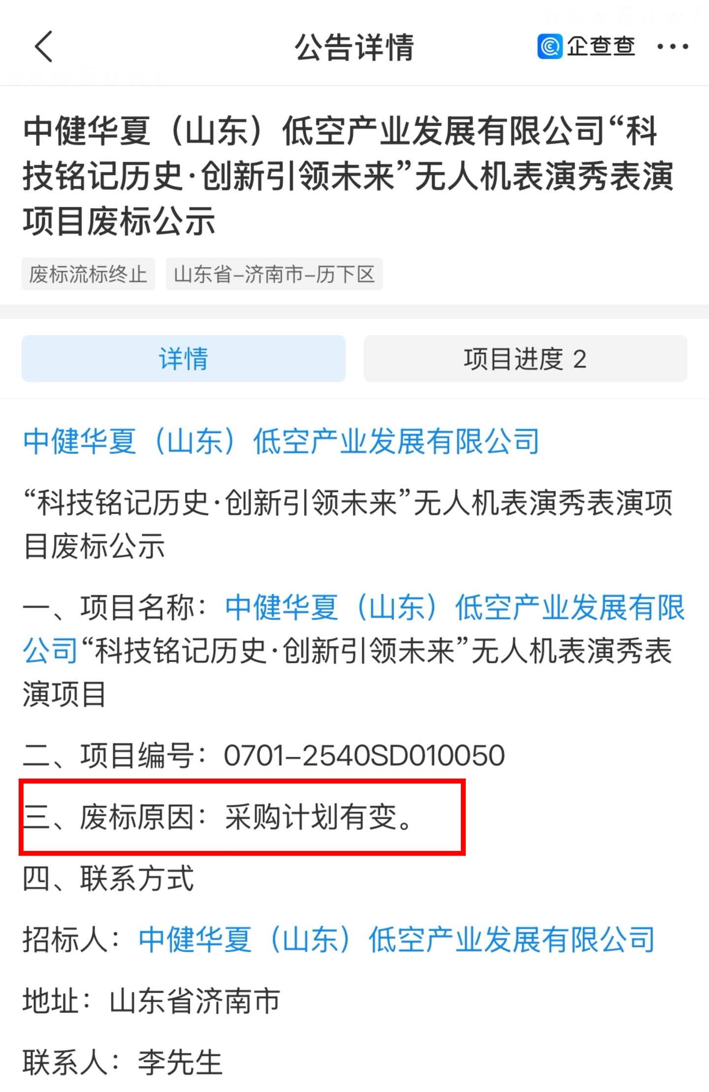 不过,尽管菏泽项目已完成备案,但中健华夏(山东)低空产业发展有限公司此前的招标动作却多次废标。例如,今年8月7日,其发布了“科学铭记历史·创新引领未来”无人机表演秀表演项目竞争性磋商公告,预算金额为120万元;8月19日,发布了中标公示,中标金额36万元,而9月4日,该项目又进行了废标公示,废标原因为采购计划有变。