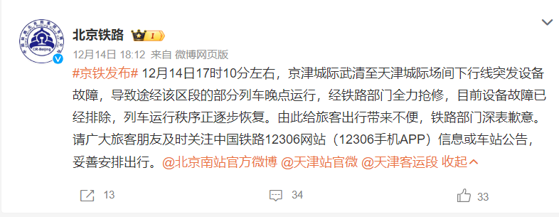 14日18:12,中国铁路北京局集团有限公司官方微博@北京铁路 发布消息称,12月14日17时10分左右,京津城际武清至天津城际场间下行线突发设备故障,导致途经该区段的部分列车晚点运行,经铁路部门全力抢修,目前设备故障已经排除,列车运行秩序正逐步恢复。由此给旅客出行带来不便,铁路部门深表歉意。请广大旅客朋友及时关注中国铁路12306网站(12306手机APP)信息或车站公告,妥善安排出行。